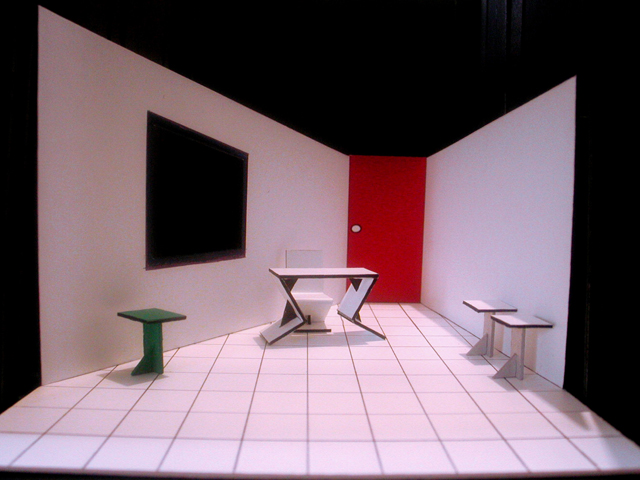 I played with the perspective of the scenography, symbolizing the moral situations that we are supposed to follow. The narrow space towards the back of the set design represents the social repression inside our society. The white walls refer to a psychiatric room where the red door is the only exit for liberation.