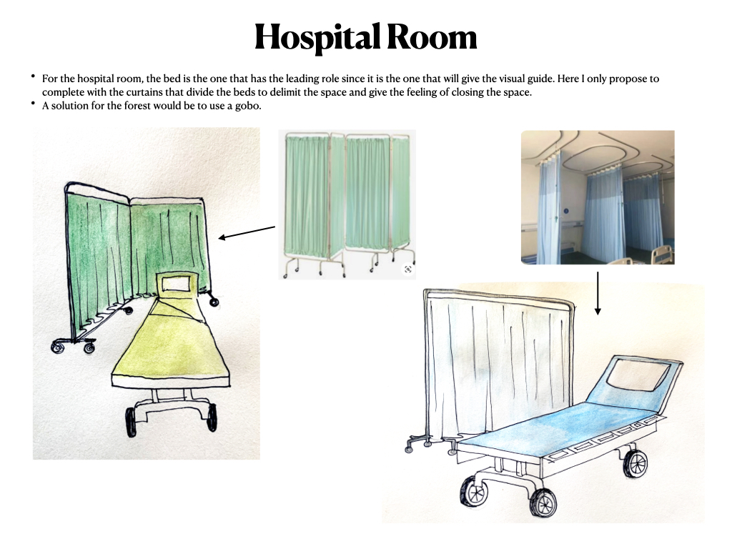 The other scenic element was to create the feeling of being in an English hospital room, considering the characteristic colors of hospitals and the basic elements.